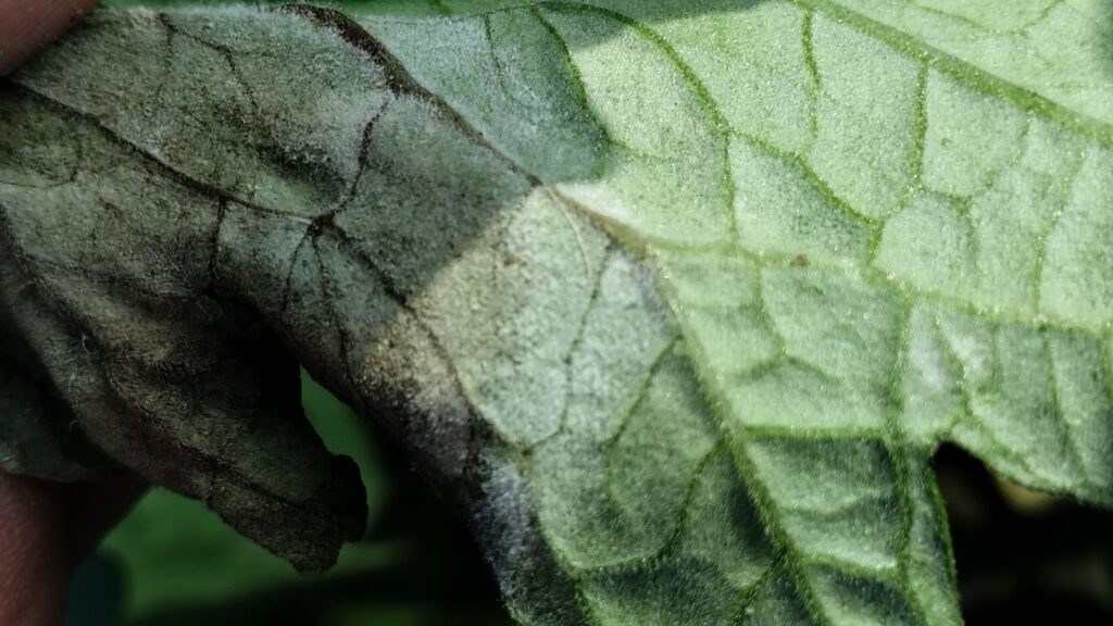 Le mildiou est causé par Phytophthora infestans, un oomycète (pseudo-champignon) considéré comme l’un des agents pathogènes les plus destructeurs des cultures de tomate et de pomme de terre. Son développement est étroitement lié aux conditions climatiques en particulier une humidité relative élevée (supérieure à 90 %) et à des températures modérées comprises entre 15 et 22 °C. Dans ces conditions, le pathogène produit des sporanges qui libèrent des spores capables de contaminer rapidement les feuilles et les tiges. Après dépôt sur des organes mouillés par la pluie, la rosée ou une irrigation excessive, ces spores germent et pénètrent dans la plante, principalement par les stomates. La maladie évolue ensuite silencieusement avant l’apparition des premiers symptômes. Chaque lésion peut produire de nouvelles spores, disséminées par le vent, la pluie ou les activités humaines, ce qui explique la propagation très rapide du mildiou en période favorable. Ainsi, lorsque l’hôte sensible, la présence de spores et un climat humide sont réunis, une épidémie peut se développer en très peu de temps. À l’inverse, des températures supérieures à 30 °C ou inférieures à 12 °C peuvent bloquer ou ralentir son développement